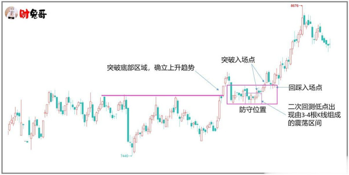 图(7) 图(7)案例是脱离底部区域的二浪回调位置,出现了二次回踩的价格走势区间震荡,第2次回踩低位还出现了3-4根K线组成的小震荡区间,这里就出现了两个区间突破的入场点,突破后回踩区间是另一个入场点,三个入场点的止损都是位于区间的下沿支撑位。 最后补充一点,震荡区间的走势最好是有规律的波动,避免波动无序和波幅较大的震荡区间。