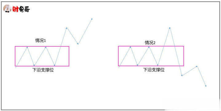 图(1) 当价格脱离成交密集区,突破方一定是要达到某个目的才去突破,比如打掉空头止损位、提高市场的建仓成本、洗盘结束、拉高出货、诱多等,无论何种目的都侧面反映出震荡区间是具有一定的战略位置。 假设某个震荡区间,价格向上突破,后市价格主要出现两种情况,一种是价格依托区间支撑继续上涨,另一种是价格突破折返向下突破区间。如图(2)所示: