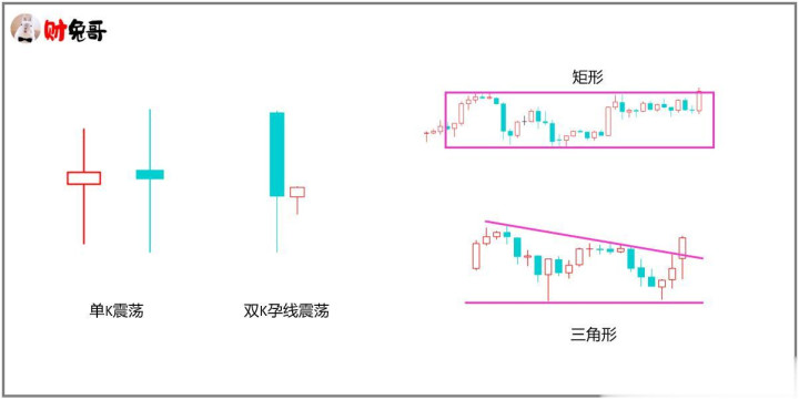 图(2) 情况1是一种突破趋势的走势形态,情况2是一种假突破的走势形态,界定这两种走势形态的一个重要特征:是否跌破区间的下沿支撑位! 震荡区间是一个重要的防守与进攻的位置区域,如果区间被突破,后市价格就不会去轻易去反向突破它,比如价格向上突破区间阻力位,后市就不会轻易反向跌破区间的下沿支撑位,若跌破下沿支撑位,就不要轻易再看多了。 震荡区间也有强弱之分,衡量一个震荡区间的,其中一个重要的参考因素是:时间跨度。时间跨度越大,那么这个震荡区间的越强,其重要性更高。 实战中,如何去运用好震荡区间的防守与进攻呢? 首先,要辨识它是震荡区间,最小的震荡区间是单K的震荡K线,其次双K的孕线形态,再到形态的矩形、三角形等。如图(3)所示: